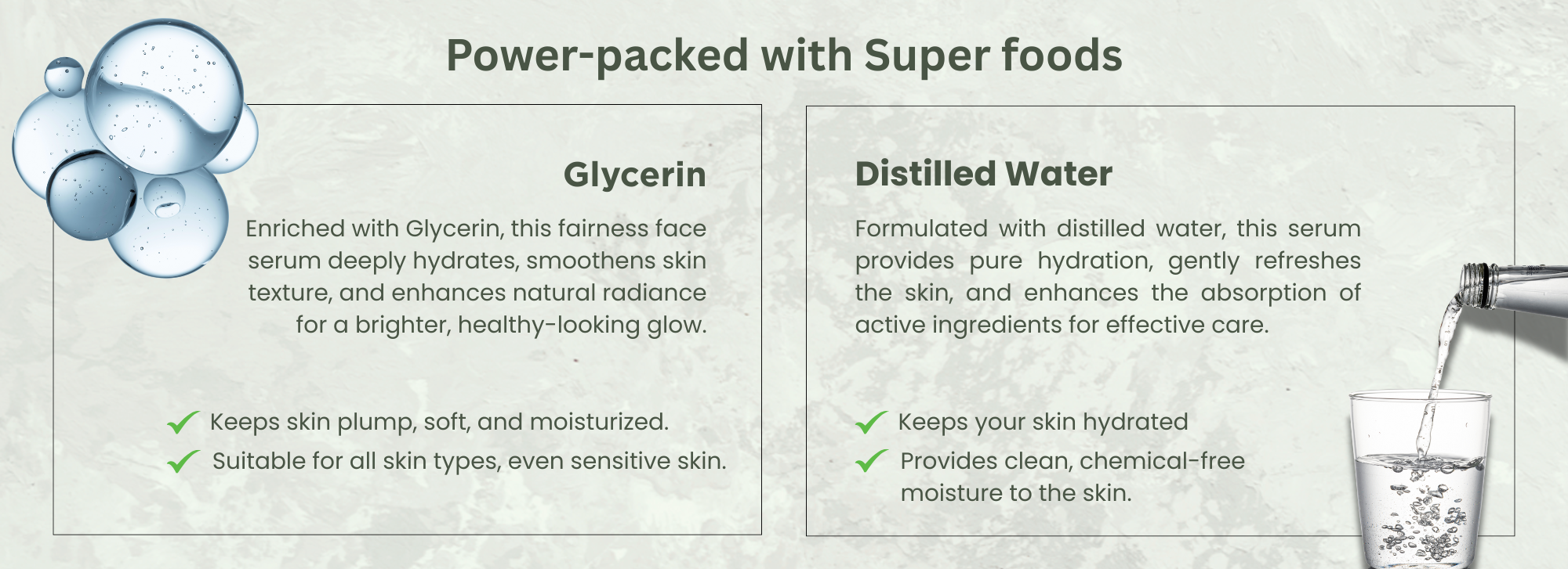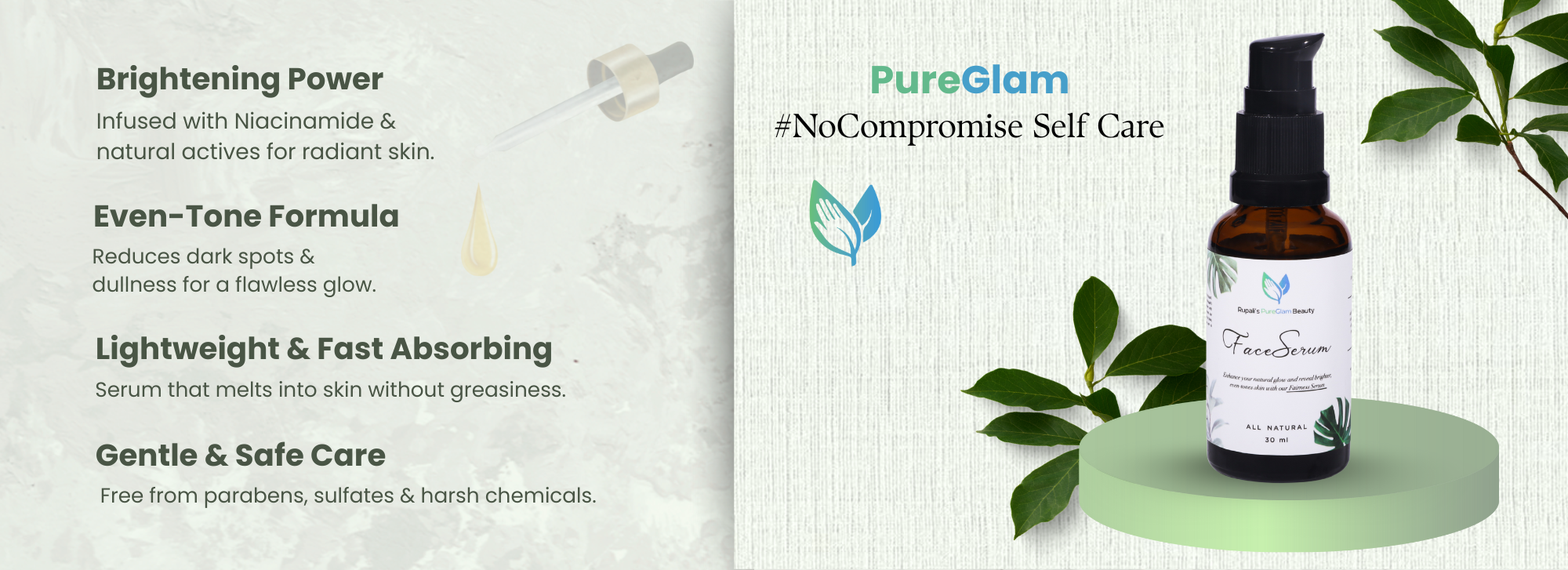 Brighten your skin naturally with PureGlam’s Fairness Face Serum. Enriched with active ingredients that target dullness, dark spots, and uneven skin tone, this lightweight serum penetrates deeply to reveal a fresh, radiant glow. With regular use, it helps restore skin clarity while keeping it hydrated, smooth, and nourished.